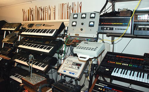 I collect and play many different instruments including different types of synthesizers. In my studio, I have many acoustic instruments as well as electronic; drums, guitars, various world instruments and several homemade instruments as well. I own a lot of different synthesizer that span years of technology - from Hammond tube synthesizers from the 1940's, to electric instruments of the 1950's and 60's, to analog synthesizer of the 1970's and 80's, to digital synthesizers of the 1980's until present. I am also fond of toy instruments - especially ones that allow you to play the chromatic scale. Here is a photo of some of the equipment in my studio.